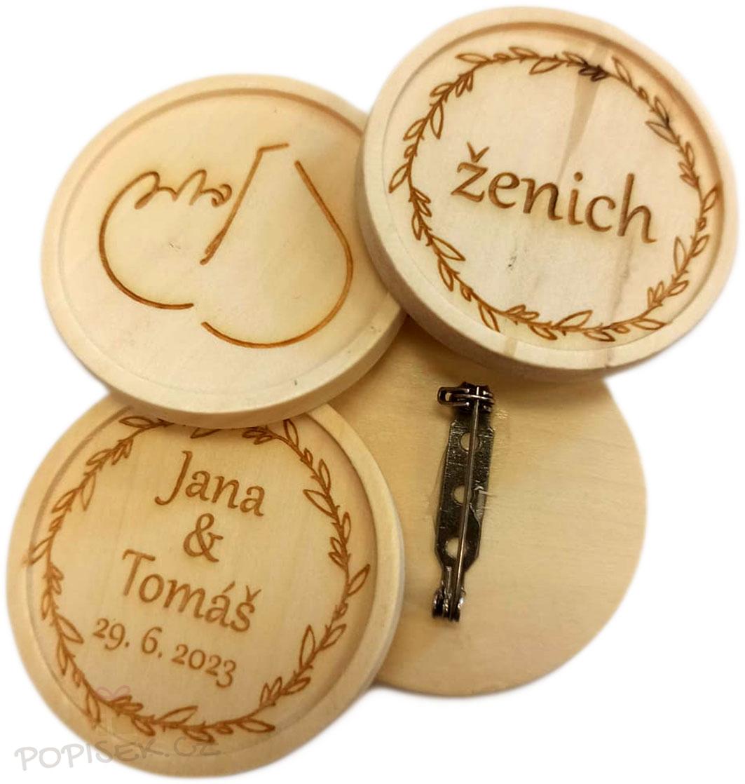 Představujeme vám náš dřevěný odznak/placku s připínáčkem - multifunkční a originální produkt pro různé příležitosti! Tento odznak je vyroben z přírodního dřeva a nabízíme možnost vygravírování vaší fotografie, data a jména. Jeho všestrannost umožňuje využití jako jmenovka na svatbách, jako ozdoba na batohu nebo jako malý dárek, například pro učitelky.