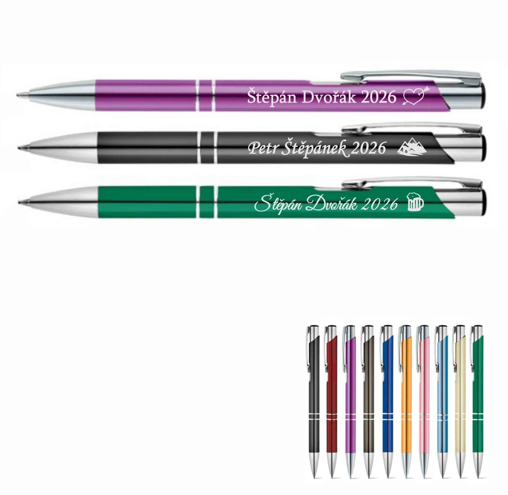 Hliníková propiska s gravírováním – jméno, text i ikona na přání