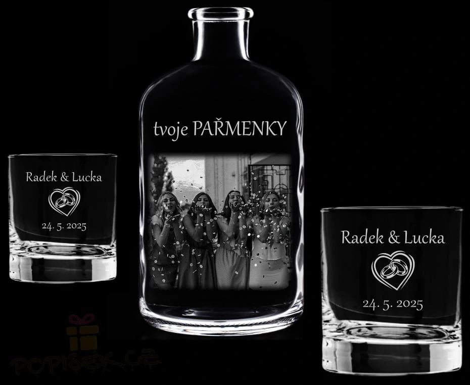 Gravírování je provedeno precizně laserem a zůstává trvale viditelné. Můžete si nechat na láhev nebo skleničky vygravírovat jméno, iniciály, vtipný citát, oblíbenou fotografii nebo libovolný motiv podle přání.
